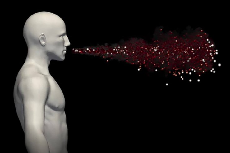 Zusätz­lich führte man Expe­ri­mente durch: In einen Kopf aus Kunst­stoff wurde eine Düse mit einem elek­tro­ma­gne­tisch gesteu­erten Ventil einge­baut, um auf präzise defi­nierte Weise ein Gemisch aus Tröpf­chen und Gas zu versprühen. Mit Hoch­ge­schwin­dig­keits­ka­meras wurde der Vorgang aufge­zeichnet, so konnte man genau messen, welche Tröpf­chen wie lange in der Luft bleiben. An dem Forschungs­pro­jekt betei­ligt war außerdem das Team von Fran­cesco Picano an der Univer­sität Padua.